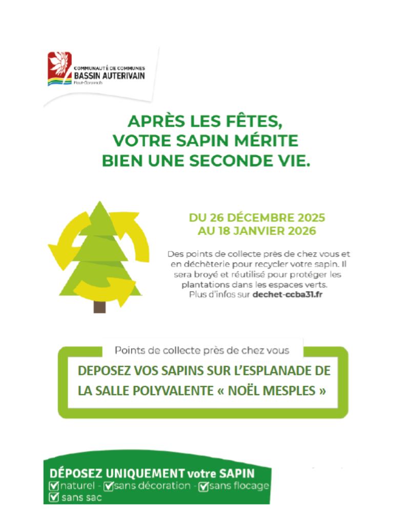 Comme tous les ans, la CCBA organise la collecte de sapins de Noël qui méritent une seconde vie. Le dépôt sera organisé sur l'esplanade de la salle polyvalente "Noël Mesplés". Les sapins doivent être déposés sans flocage, sans décorations ni sacs. Merci de respecter ces consignes.