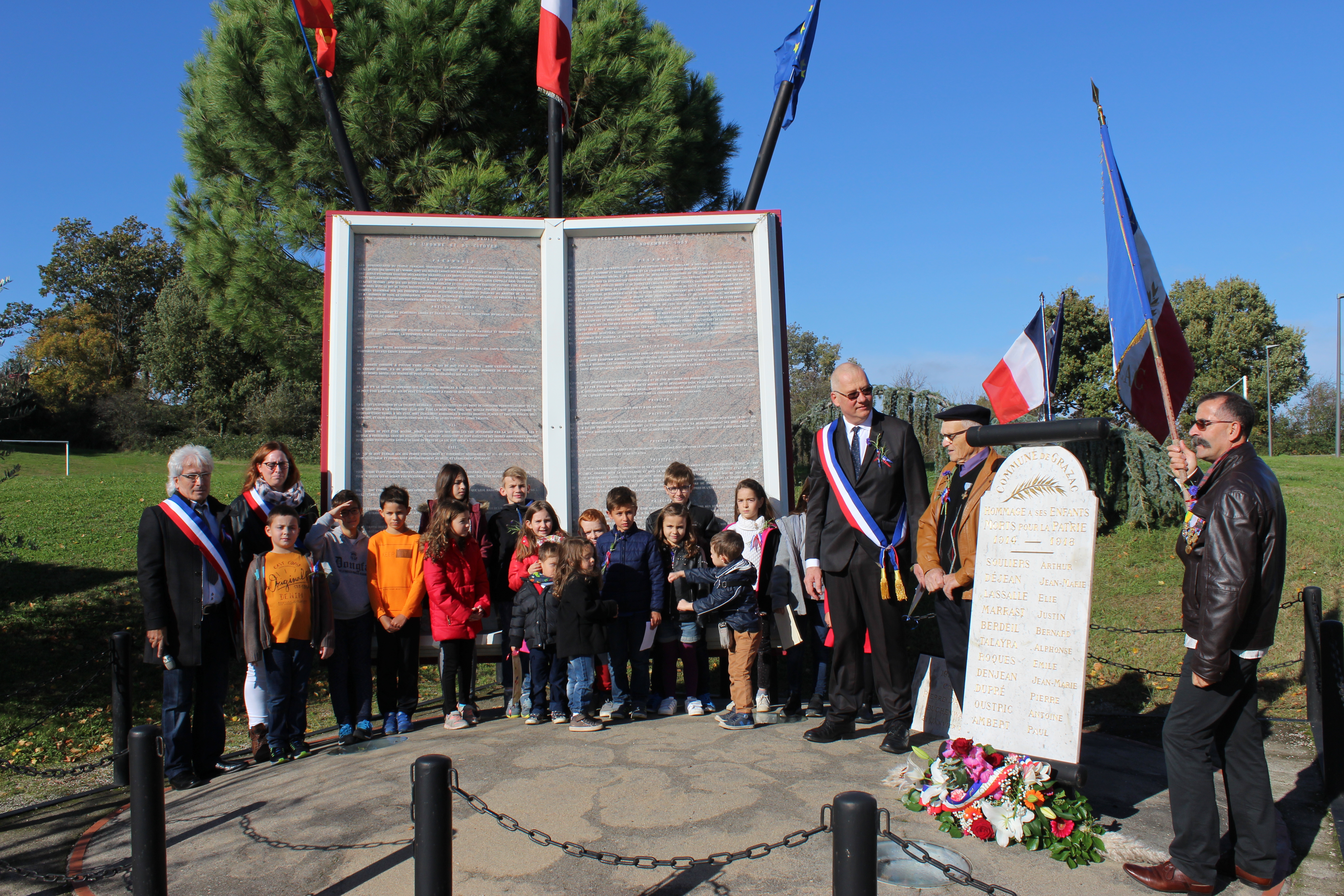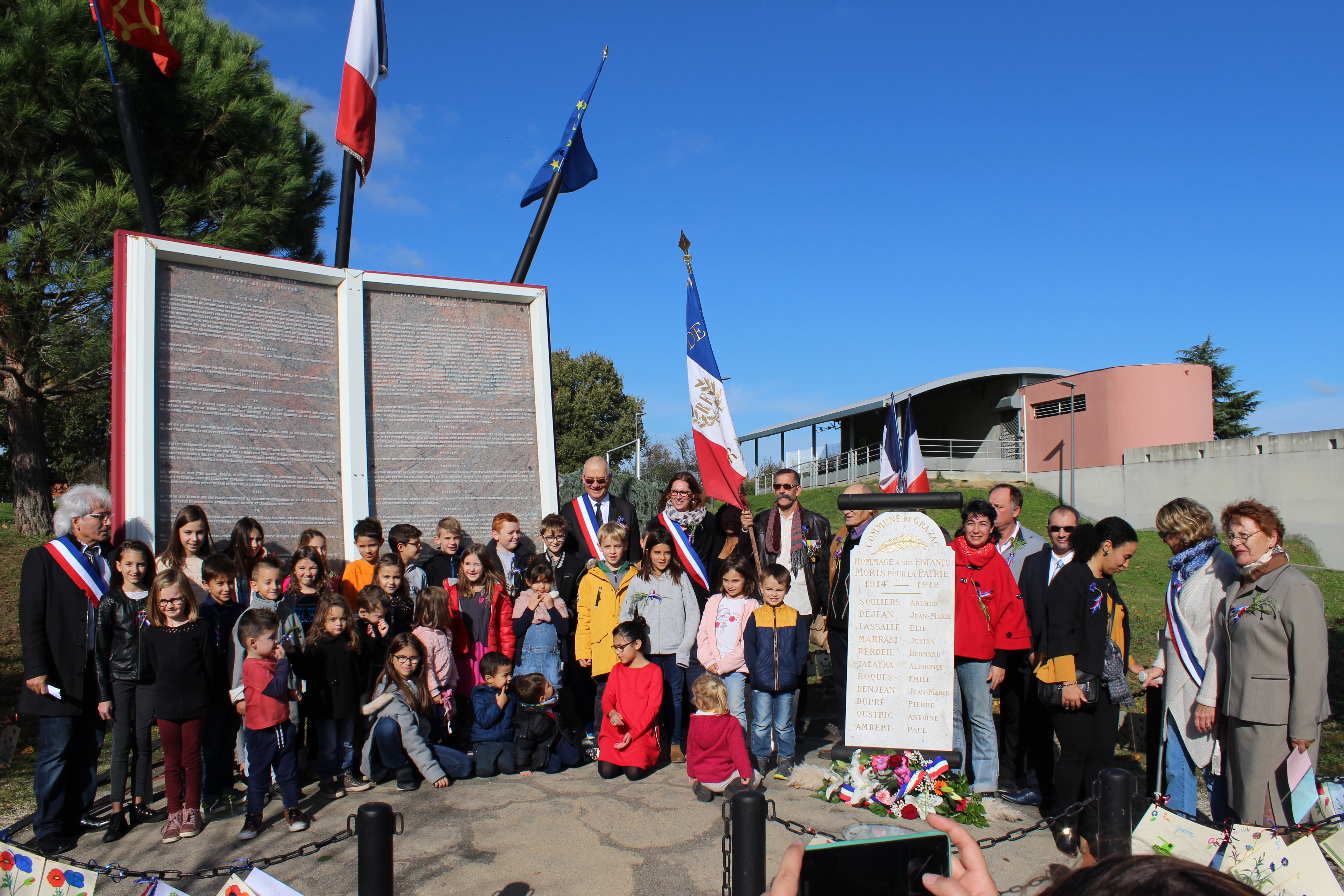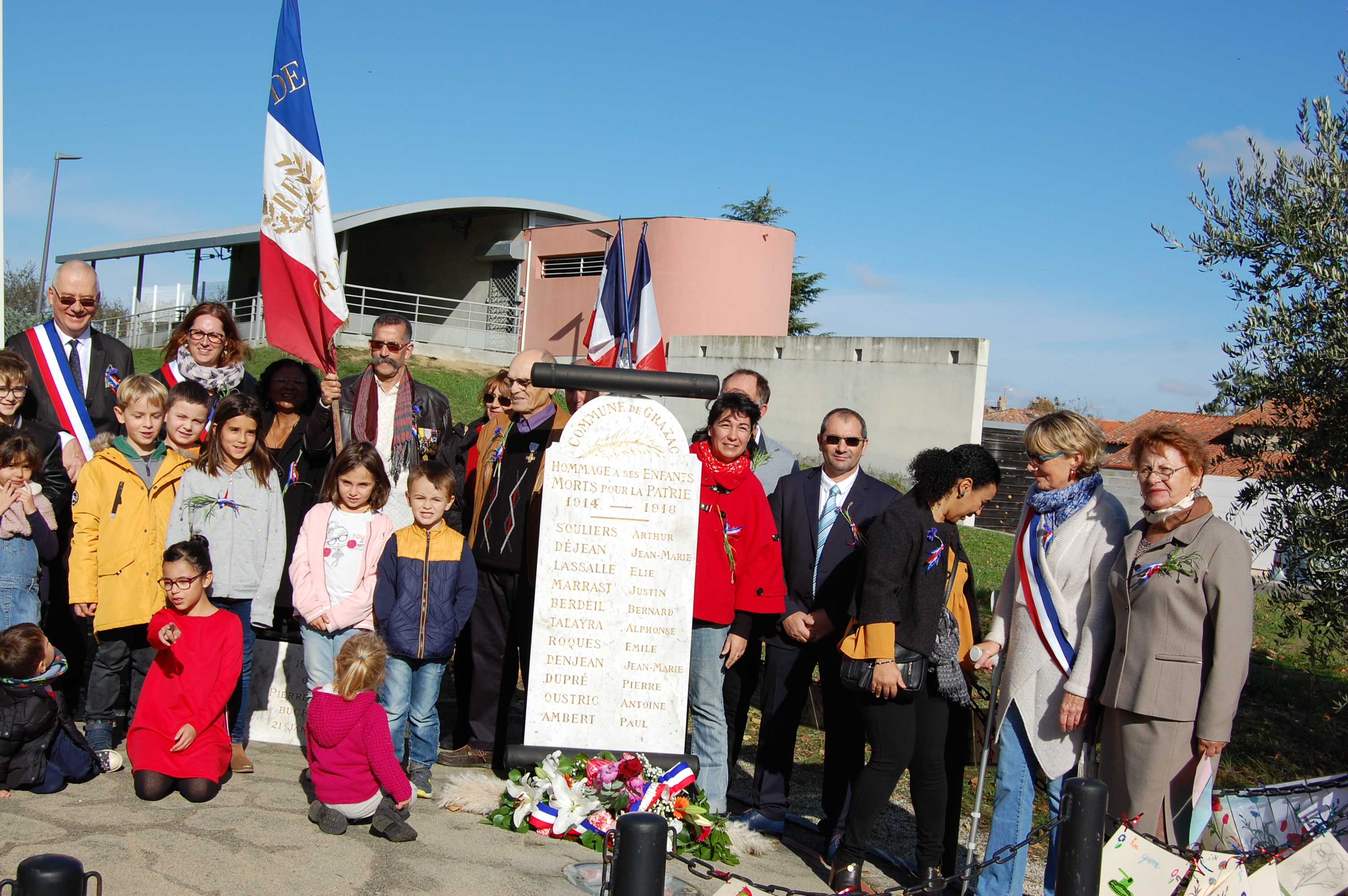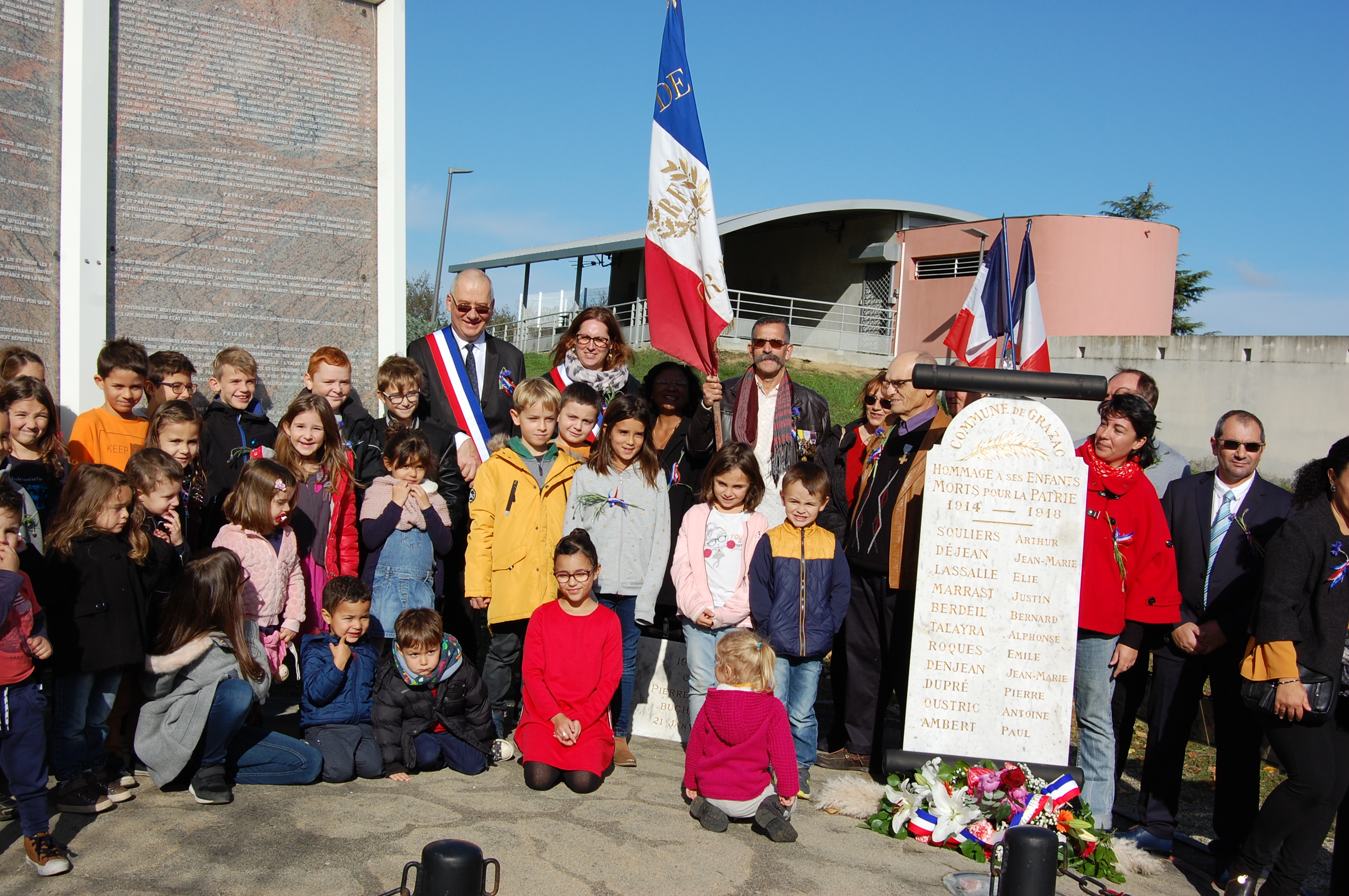 En ce jour de commémoration du centenaire de l'armistice du 11 Novembre 1918, Les Grazacoises et Grazacois sont nombreux à être présent pour honorer " nos poilus ". La participation massive des enfants à cette commémoration, assurera la continuité de la mémoire. Les Grazacoises et Grazacois avaient rendez-vous devant l'église, et c'est en procession au son des cloches qui sonnaient à la volée, que le cortège s'élançait derrière les enfants qui portaient la gerbe, direction le monument aux commémorations.