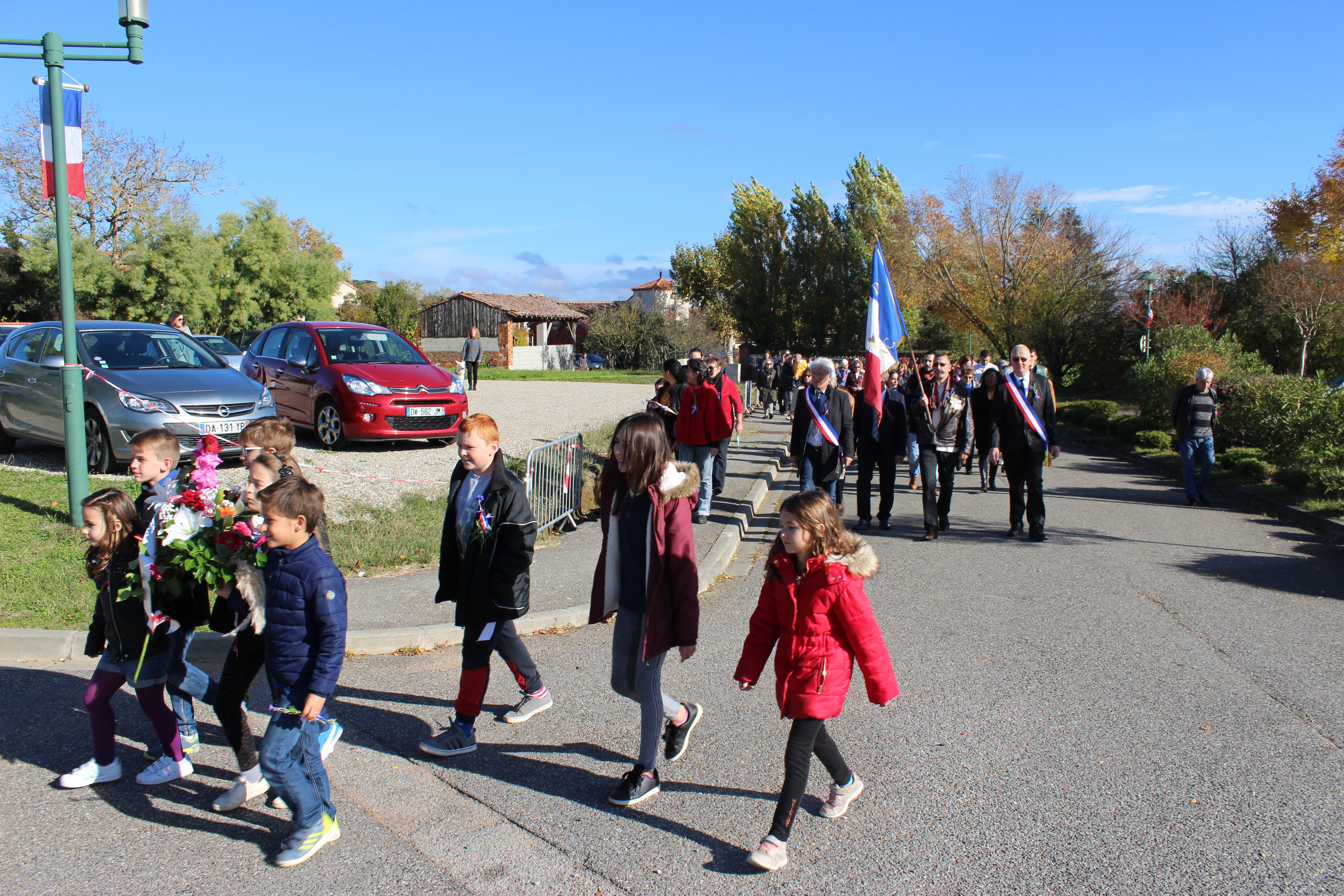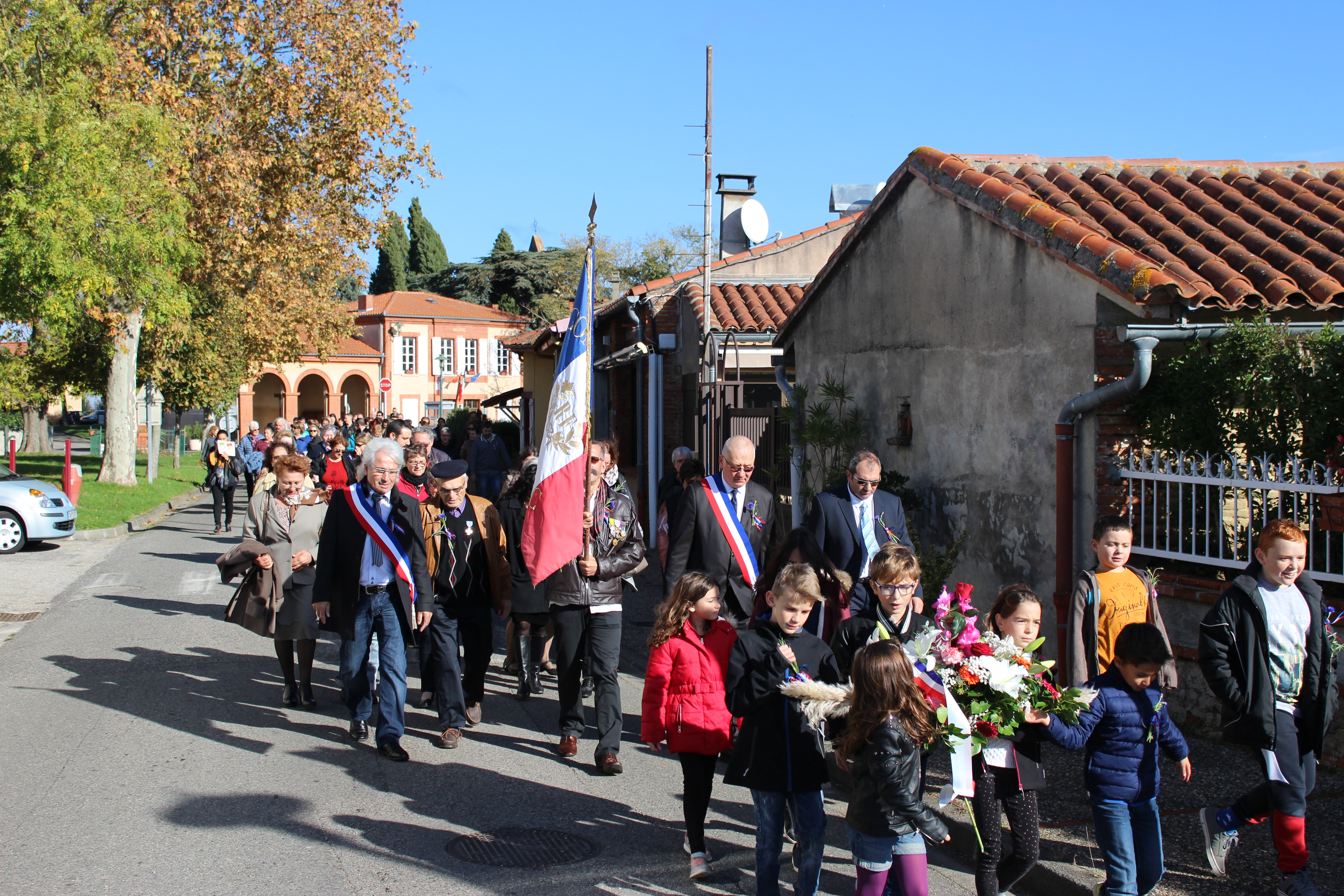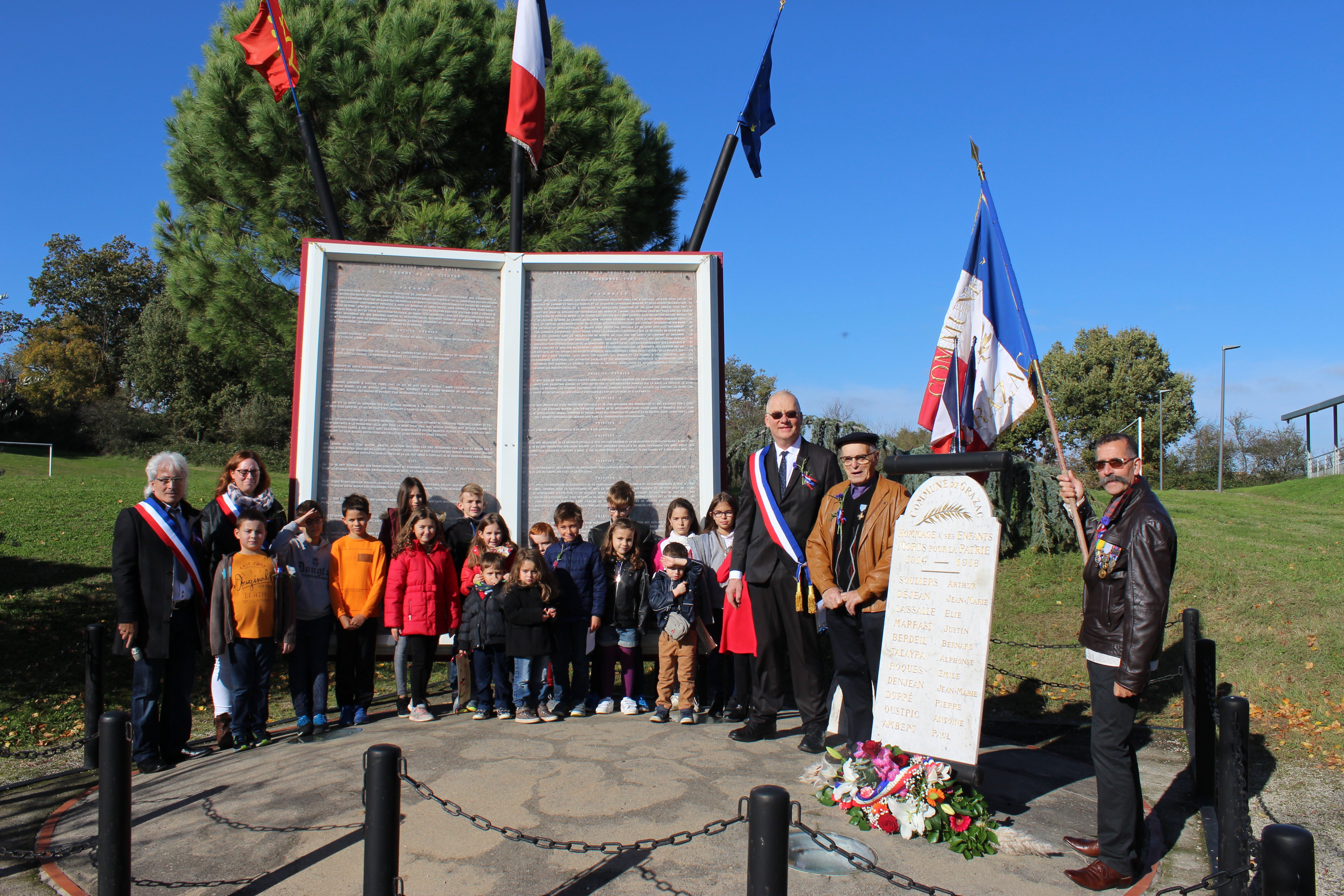 En ce jour de commémoration du centenaire de l'armistice du 11 Novembre 1918, Les Grazacoises et Grazacois sont nombreux à être présent pour honorer " nos poilus ". La participation massive des enfants à cette commémoration, assurera la continuité de la mémoire. Les Grazacoises et Grazacois avaient rendez-vous devant l'église, et c'est en procession au son des cloches qui sonnaient à la volée, que le cortège s'élançait derrière les enfants qui portaient la gerbe, direction le monument aux commémorations.