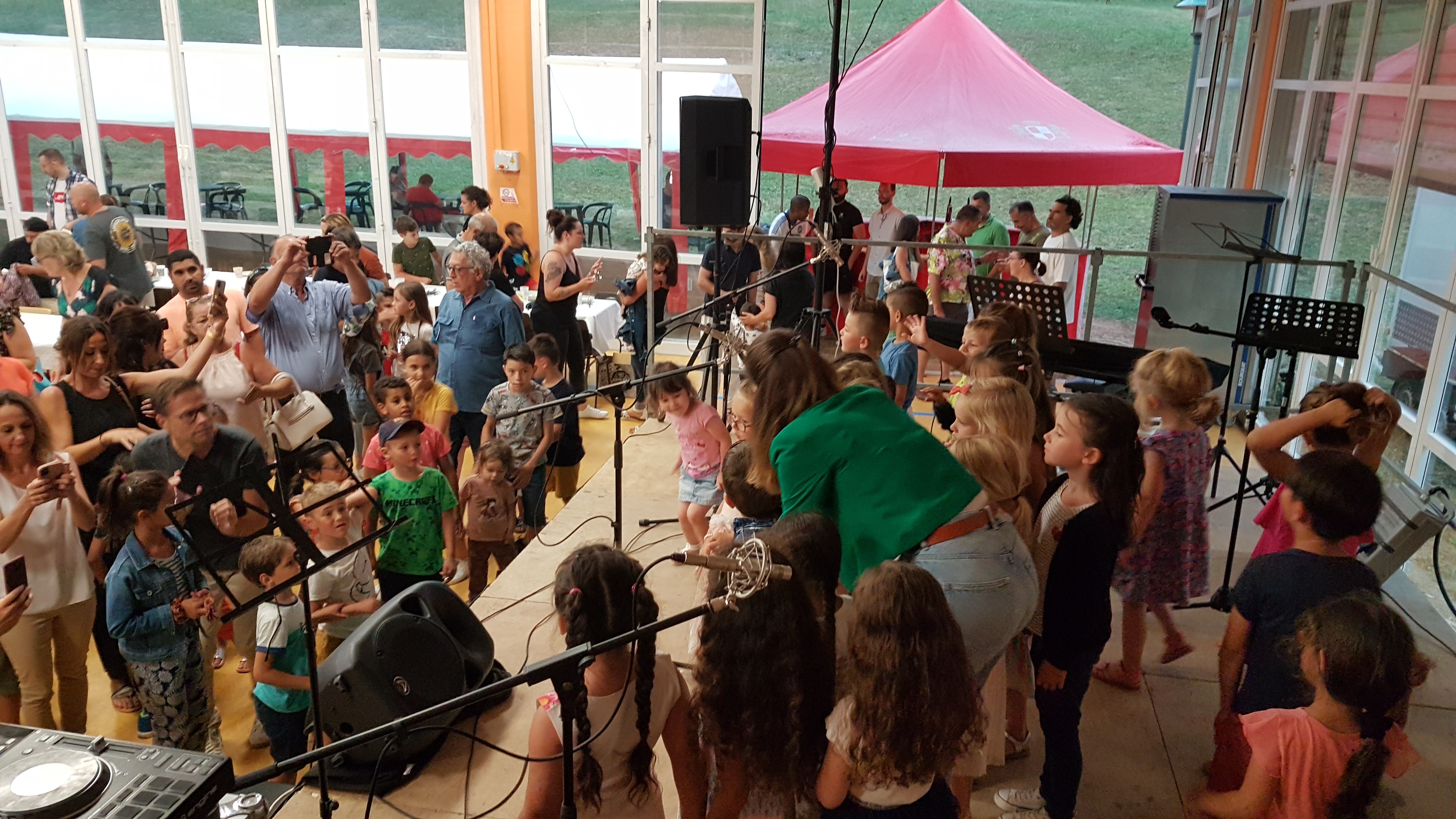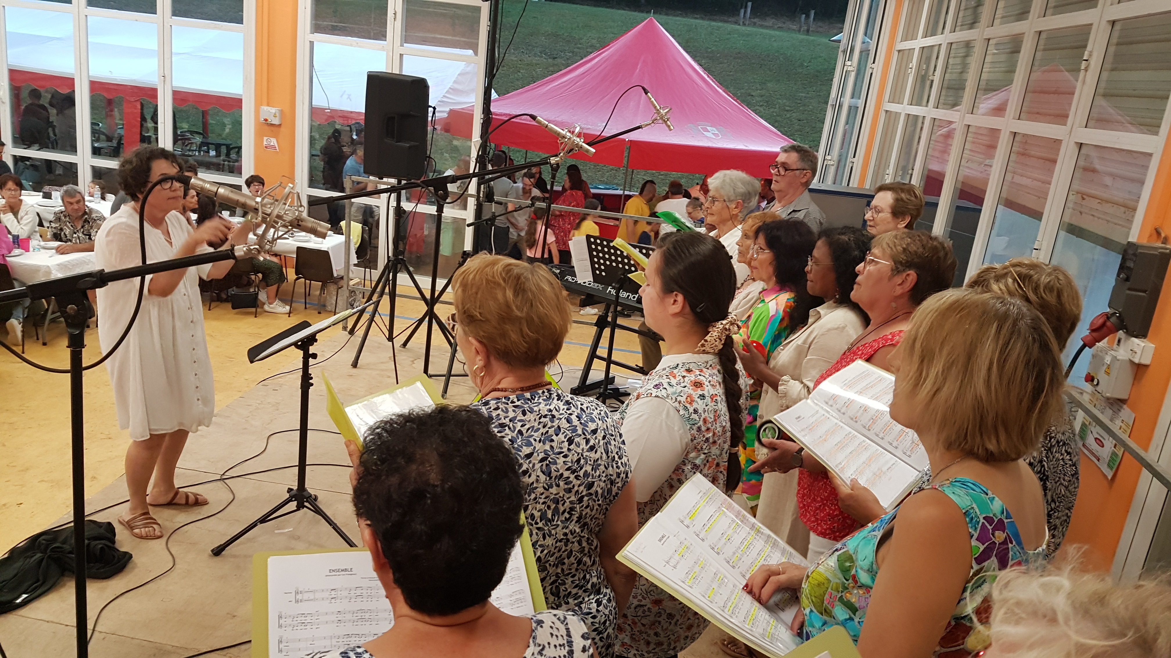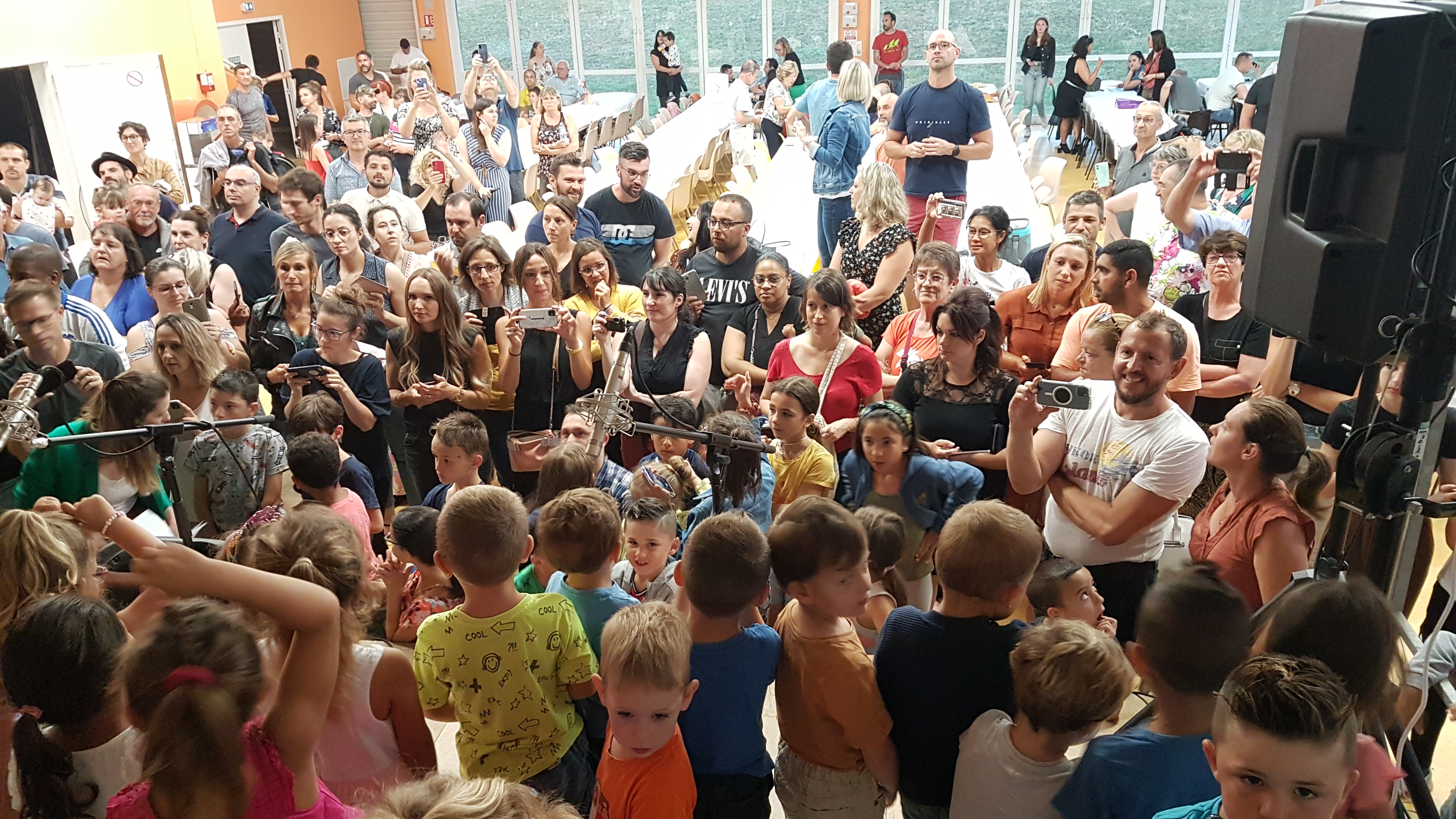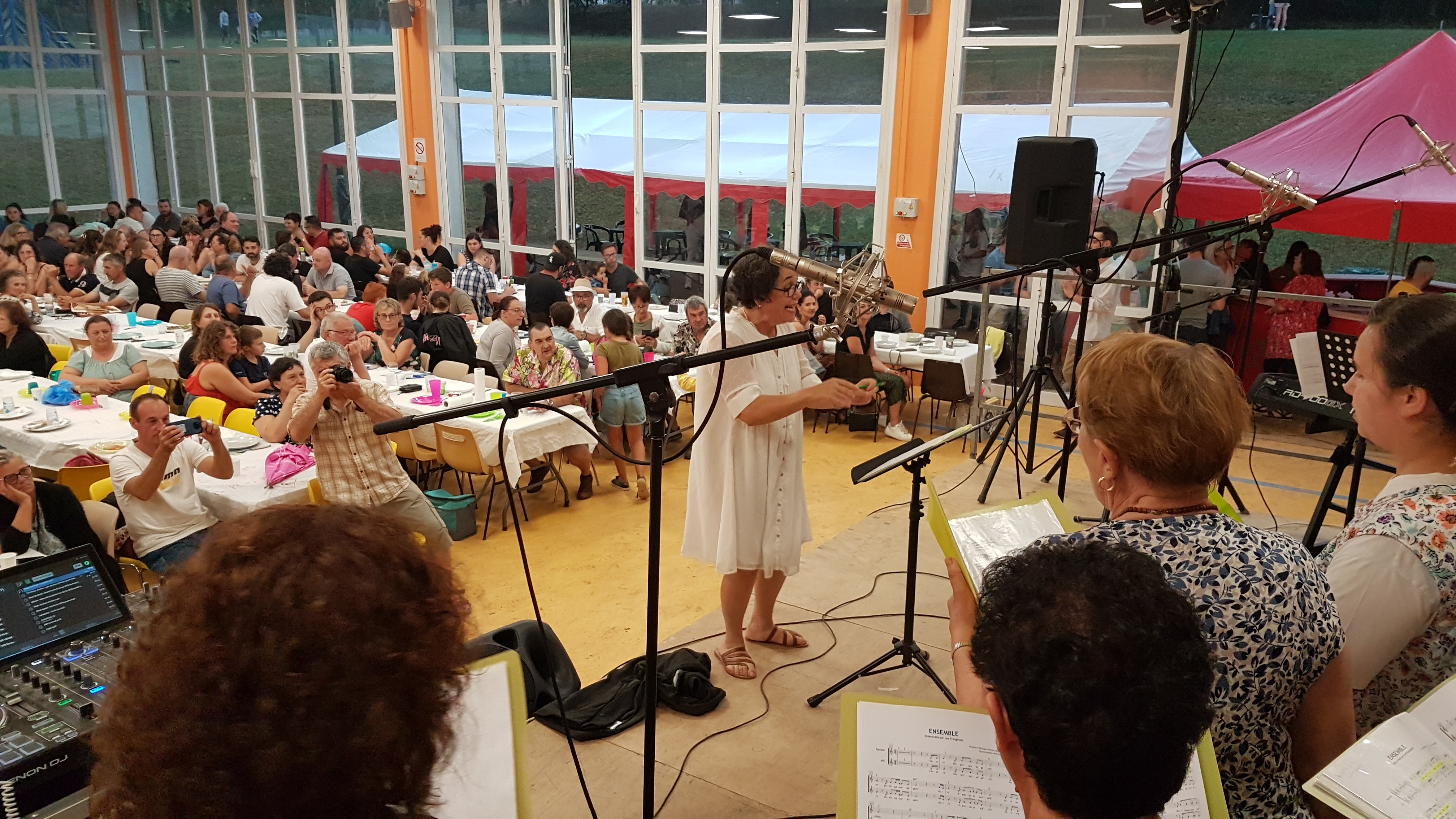 Pendant ce repas, plusieurs enfants, spontanément, ont pris possession de la scène pour nous chanter quelques airs actuels, mais à leur manière, quelle fraicheur. On n’a pas retenu tous les prénoms, mais ils se reconnaitrons sur les photos. Et pour faire la place pour le dessert, Jean-Luc proposait une demi-heure de danse festive, quel enthousiasme !