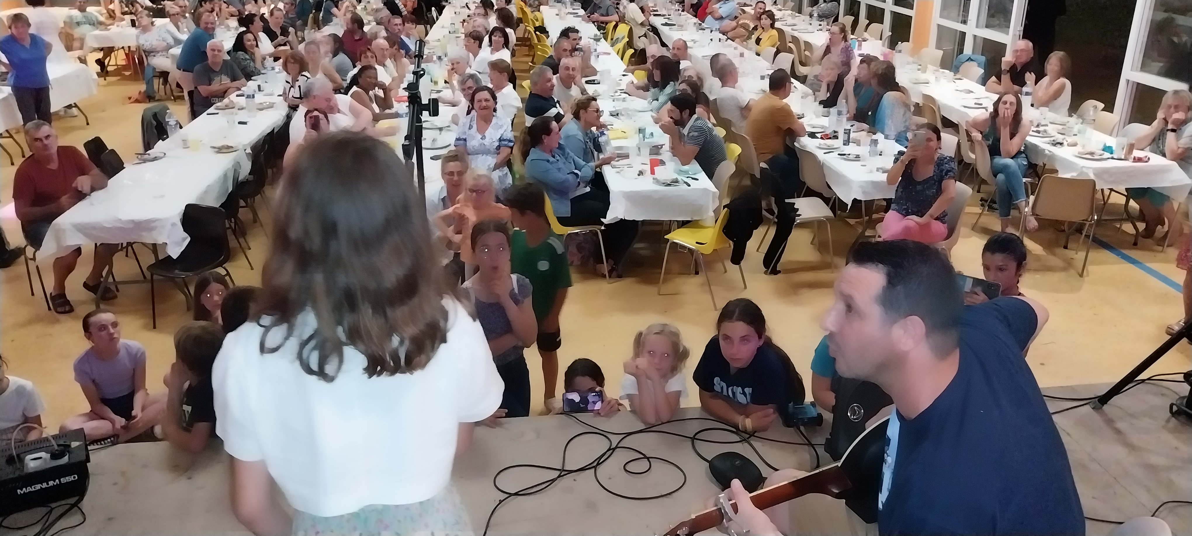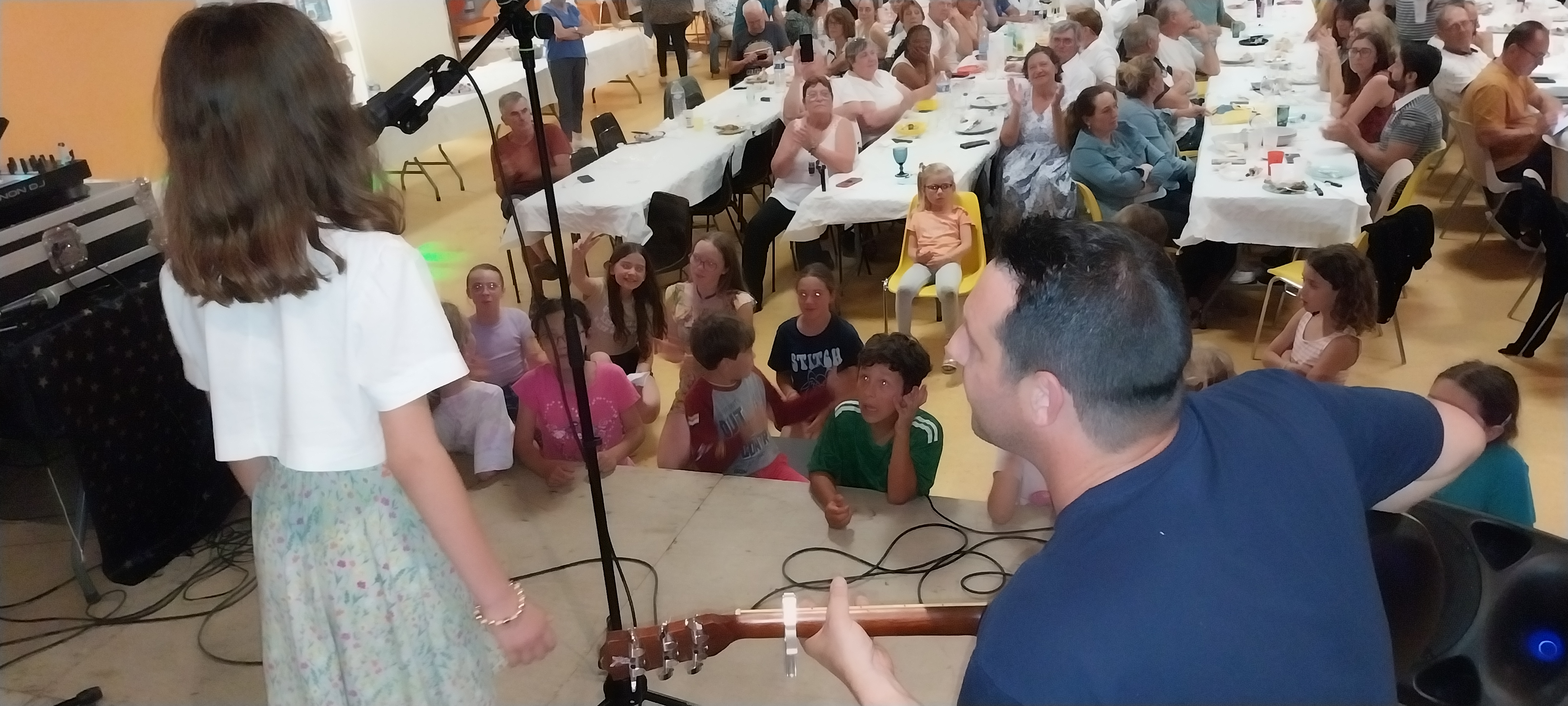 Pendant le repas, EVAaccompagnée à la guitare par florian son papa, nous enchantait par sa prestation de trés bon niveau sous le regard intense de ces fans, ""dèjà" qui ont chanté ensemble. On n'a pas retenu tous les prénoms, mais ils se reconnaîtrons sur les photos. Et pour faire la place pour le dessert, Jean-Luc proposait aux convives de chanter plusieurs airs entraînant, et une demi-heure de danse festive, quel enthousiasme !