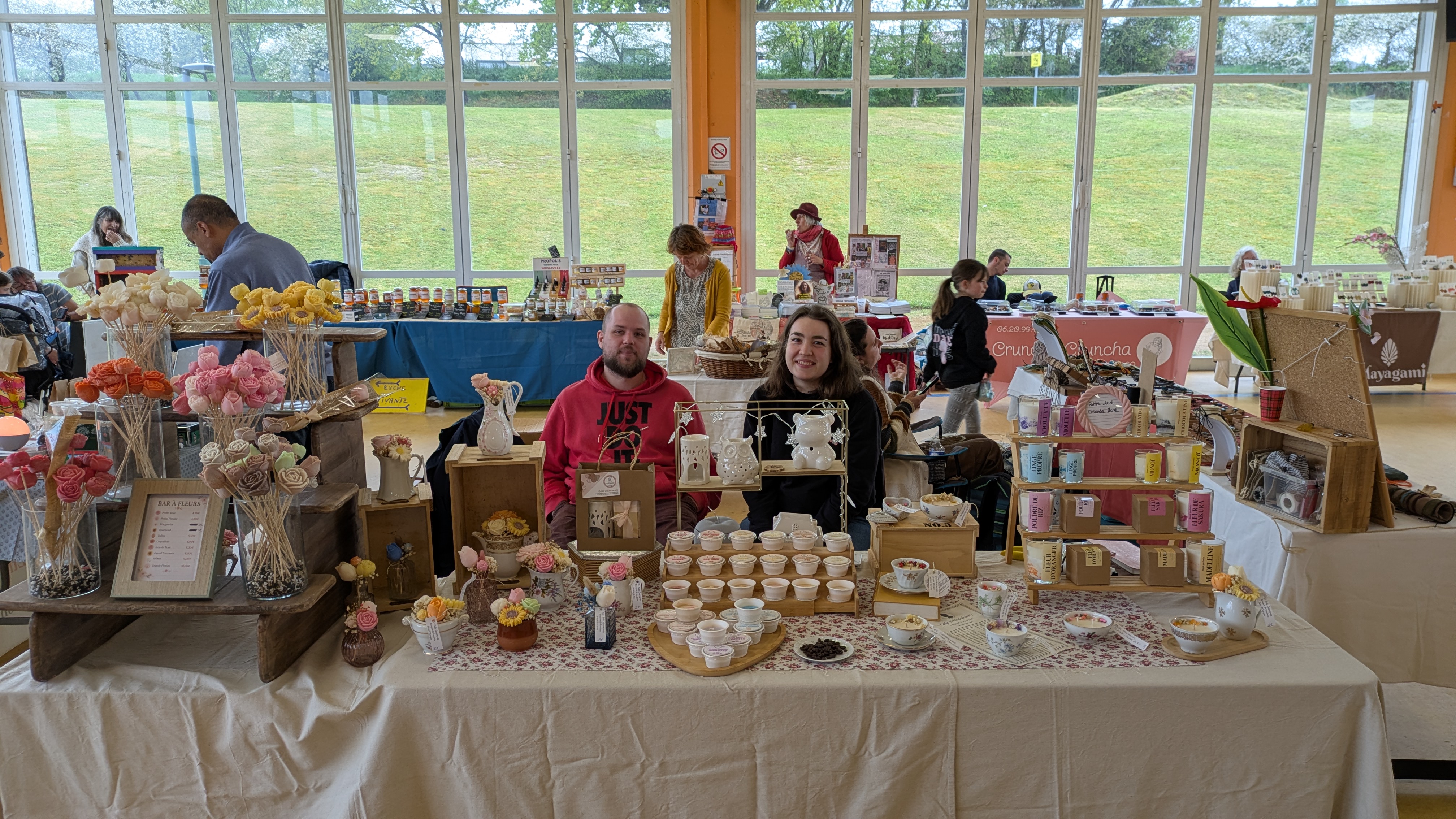 Malgré la météo pluvieuse en ce dimanche 12 avril, les exposants d'artisanat local étaient là au rendez-vous. Bougies parfumées, travaux de couture, bijoux, miel, tisanes et pates de fruits, produits et épices de Madagarcar... Il y avait de l'artisanat pour tous les goûts ! Les stands de plantes n'étaient pas en reste, avec des plantes intérieures, et des semis en extérieur, ainsi qu'une grande diversité de fruits et légumes pour le potager, fleurs en tout genre mais surtout de saison !