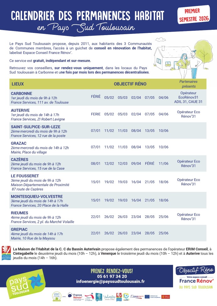 Voici les calendriers de permanences proposés par le Pays du Sud Toulousain (PETR) et la Communauté de Commune du Bassin Auterivain (CCBA) en partenariat avec la Maison de l'habitat et le cabinet d'études ERIM